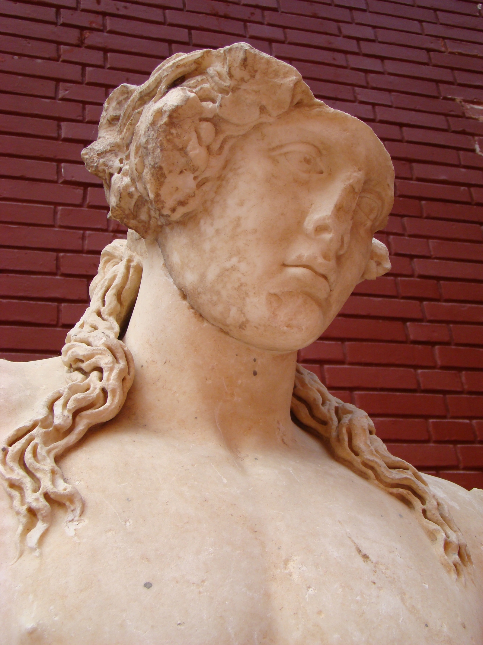 This image shows a facial detail of a white marble statue of Dionysos leaning on the trunk of a tree from the Fountain of Trian (also known as the Nymphaeum Traiani). This sculpture dates from the 2nd century CE and it measures 189 cm. This object is located at the Ephesus Archaeological Museum in Selcuk, Turkey.