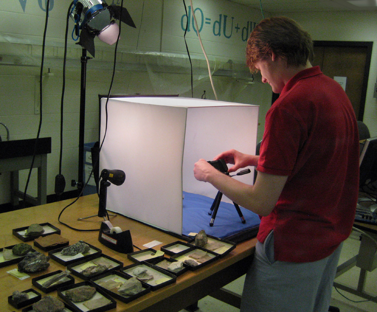 Corbitt working in the lab on Lardner Vanuxem Mineral Collection.