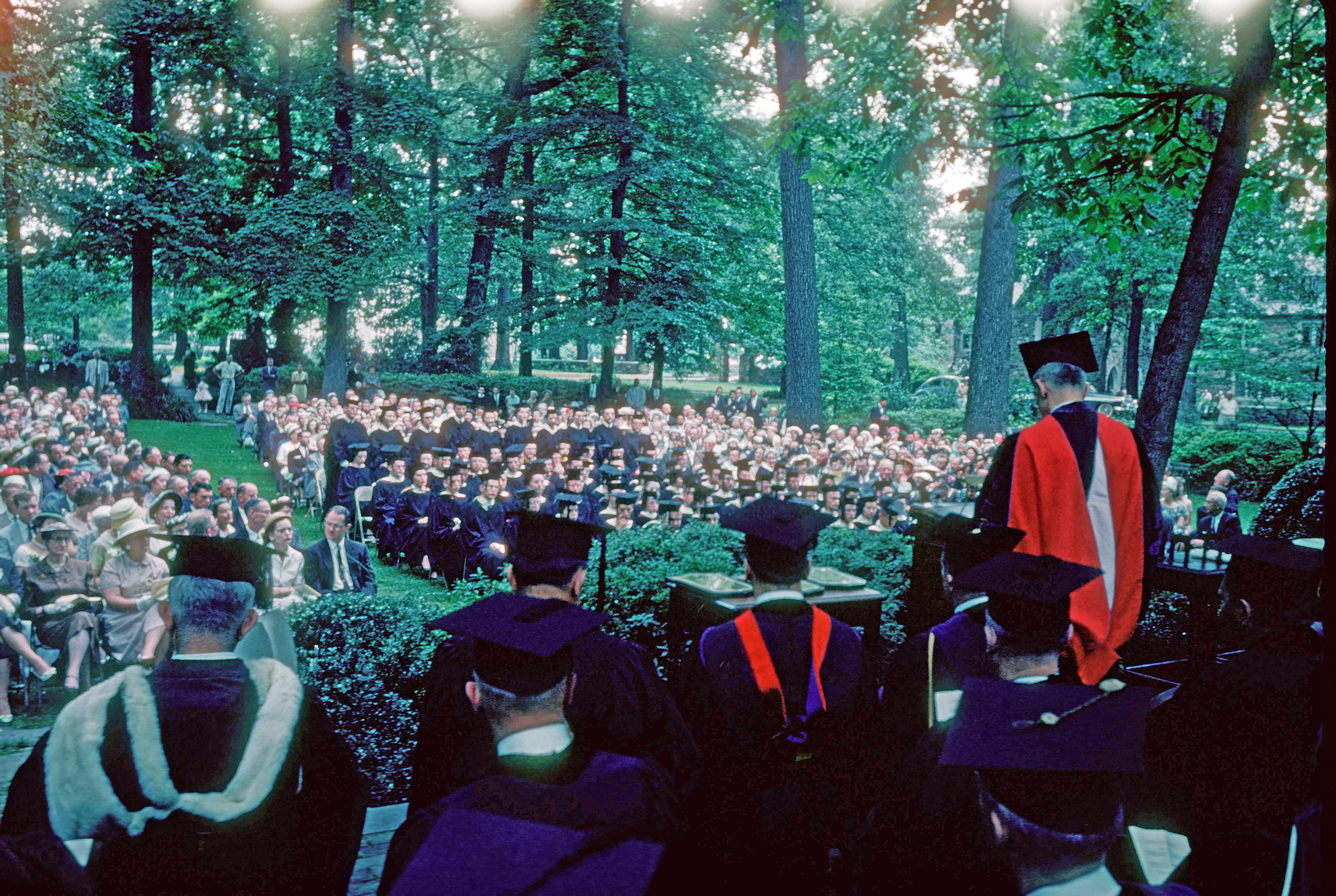 Presdient Rhodes speaking during the Commencement ceremony in Fisher Gardens in 1959.