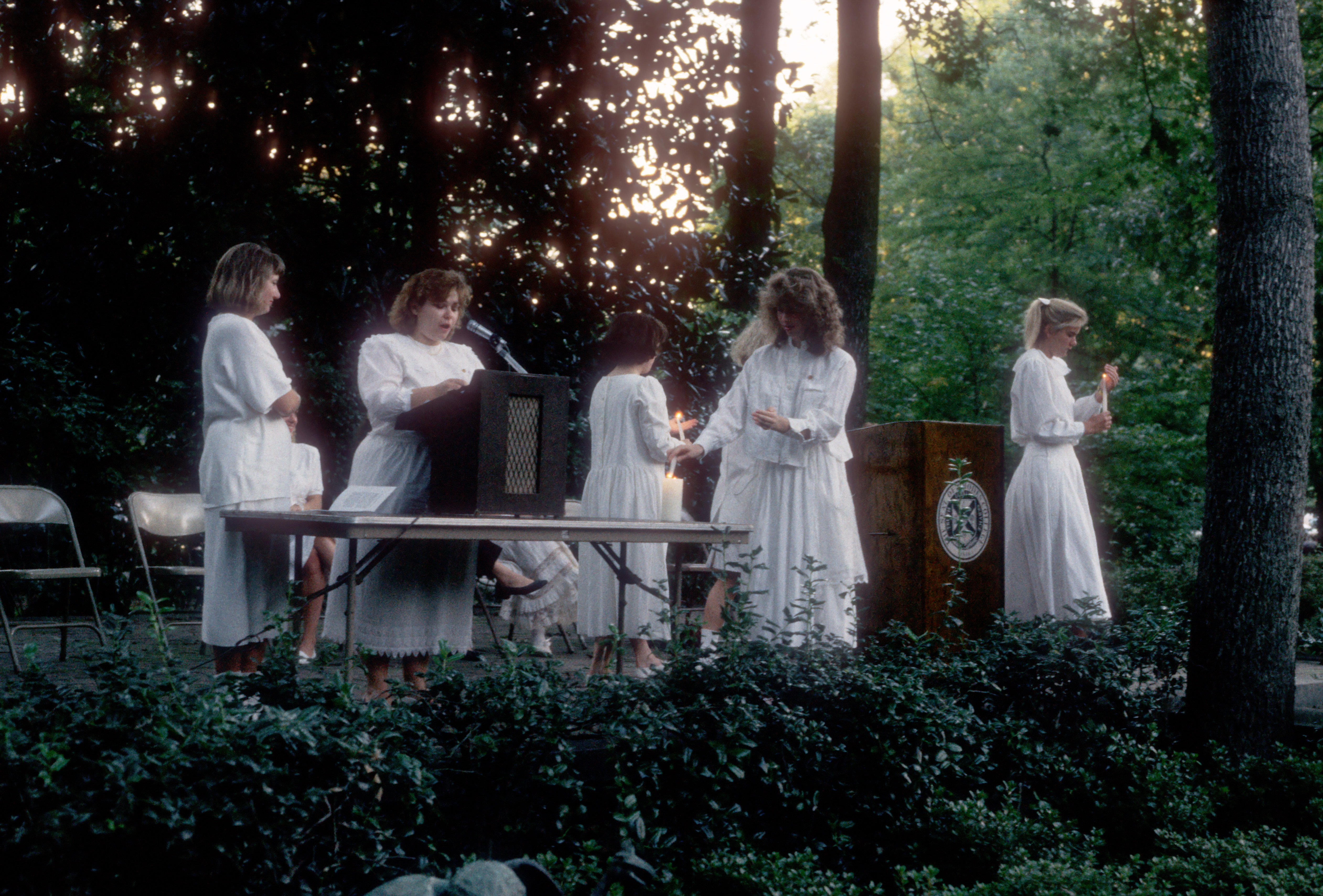 Sorority pledges lighting candles at initiation in Fisher Garden.